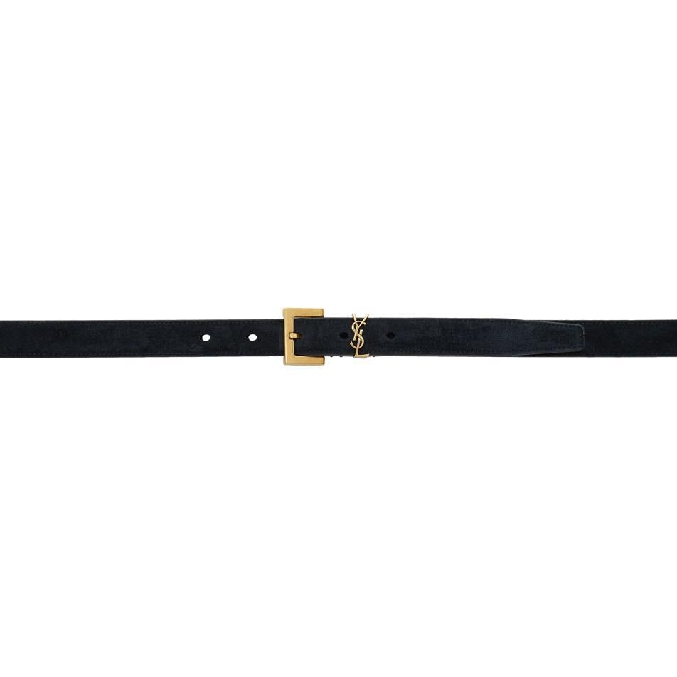Calfskin suede belt in black. Logo hardware at adjustable pin-buckle fastening. Approx. 0.75 width. Supplier color: Black Calfskin. Brand: Saint Laurent