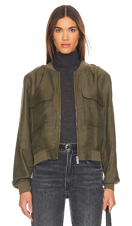 Sanctuary Eve Bomber in Olive. - size S (also in XL, XXL) Sanctuary Eve Bomber in Olive. - size S (also in XL, XXL) Self: 71% rayon 29% linen Lining: 100% rayon Contrast Fabric: 98% cotton 2% spandex. Made in China. Machine wash. Front zipper closure. Breast flap pockets. Elastic cuffs. Satin twill fabric. SANC-WO325. CJ0970CR6. Design with reason, design with soul: give us the Sanctuary of fashion with sense. Shop the latest in fashion from Sanctuary