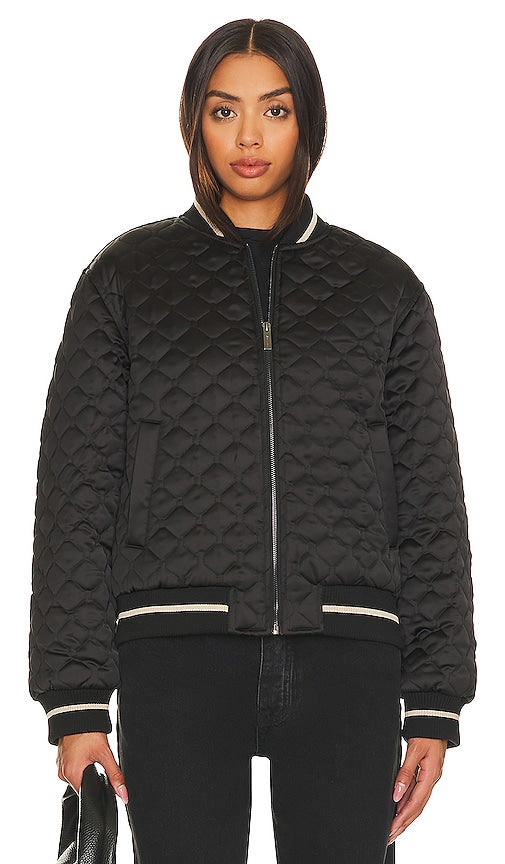 Sanctuary Marilyn Bomber Jacket in Black. - size L (also in XL) Sanctuary Marilyn Bomber Jacket in Black. - size L (also in XL) Self: 97% polyester 3% spandex Lining: 100% polyester. Made in China. Machine wash. Front zipper closure. Side slant pockets. Quilted satin fabric with ribbed trim with contrast striping. SANC-WO322. CJ0922CC6. Design with reason, design with soul: give us the Sanctuary of fashion with sense. Shop the latest in fashion from Sanctuary
