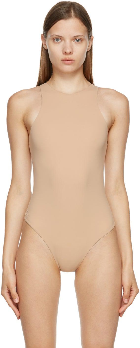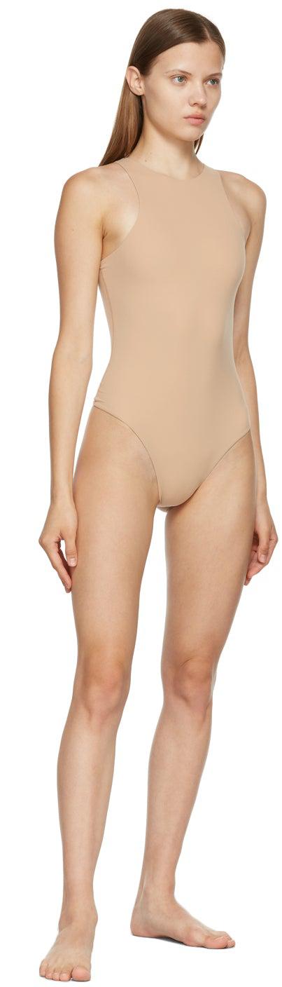 Sleeveless stretch nylon jersey bodysuit in beige. Crewneck collar. Press-stud fastening at thong-style bottom. Fully lined. Tonal hardware. Supplier color: Clay 76% polyamide, 24% elastane. Brand: SKIMS