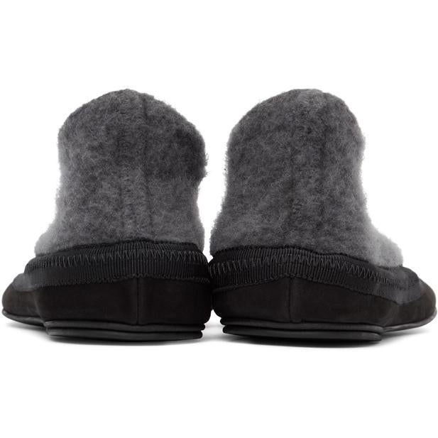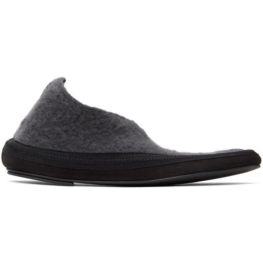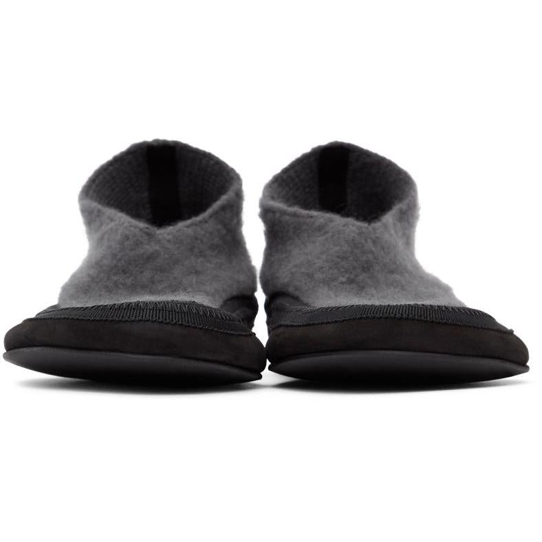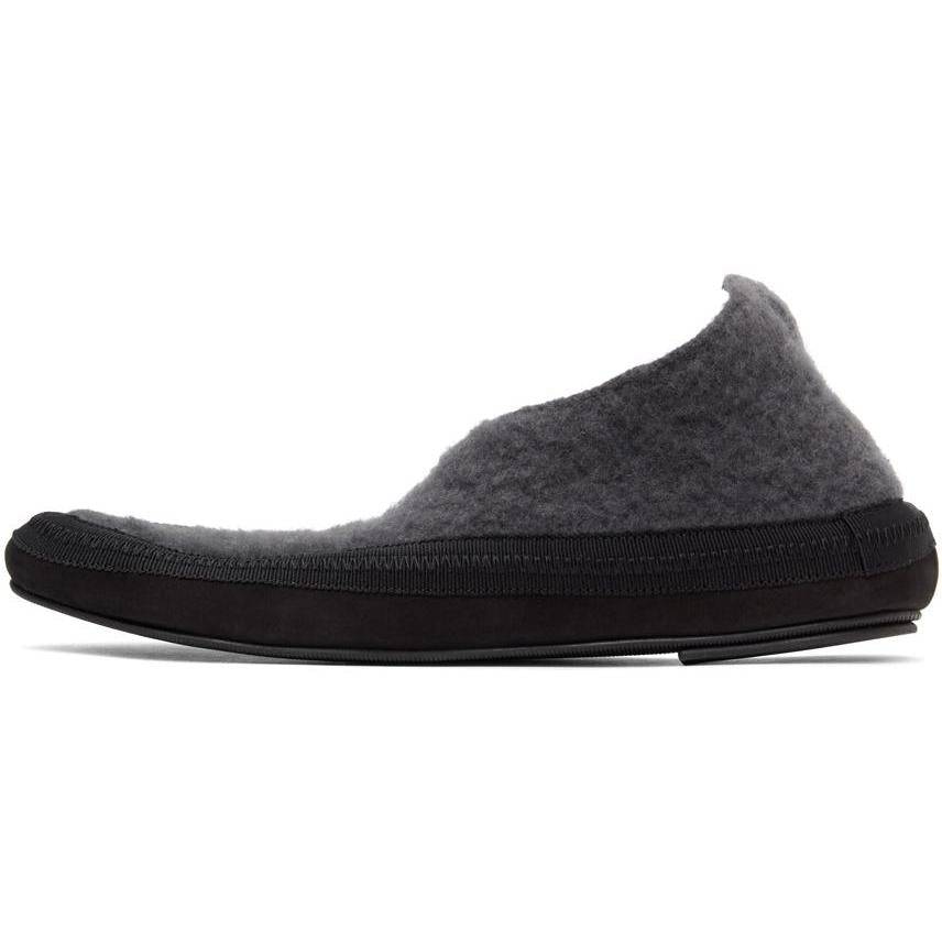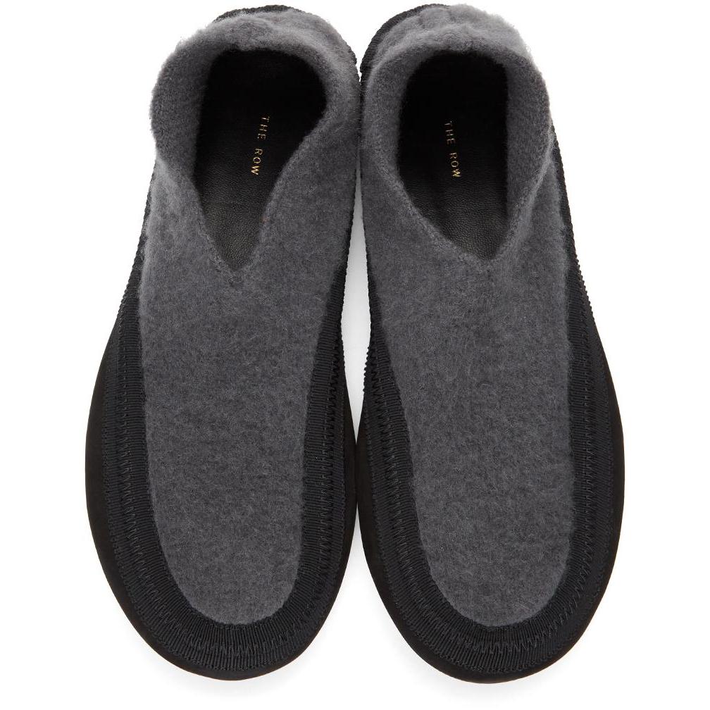 Cashmere loafers in grey. Round toe. Gold-tone logo stamp at black buffed leather footbed. Grosgrain trim and topstitching in blue at welt. Suede-covered midsole in black. Rubber outsole in black. Supplier color: Anthracite Upper: cashmere, leather. Sole: rubber. Brand: The Row